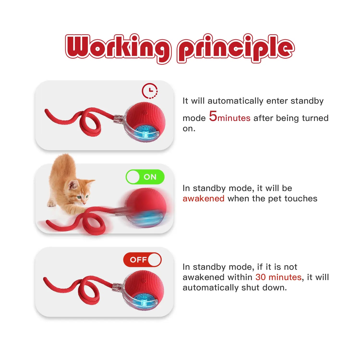 Product Specifications: Longer Runtime – Supports up to 90 minutes of continuous playtime. Universal for Cats & Dogs – Designed for both feline and canine companions. Long-Press Power Button – Hold for 3 seconds to turn the device ON/OFF. Short-Press Power Button – Single press to cycle through lighting modes (Blue, Purple, Green). Red blinking light – requiring charging. Smart Power Management – Active Play Mode: After 5 minutes of play, the device enters standby mode. This design ensures longer playtime, energy efficiency, and smart interaction for pets.