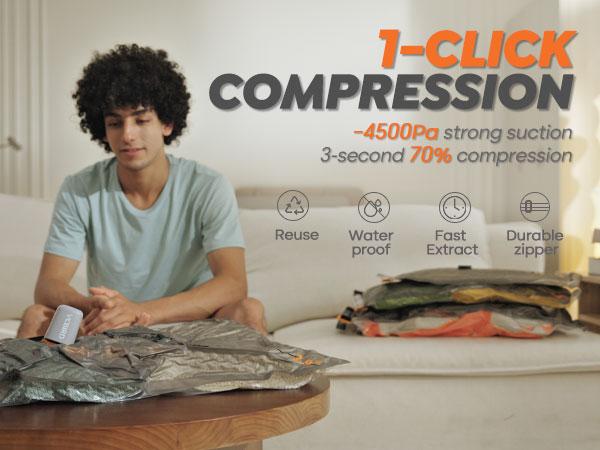 The Turbo X8 set features an electric pump that compresses bags automatically with a single press. It's fast, smooth, and hands-free. This design ensures efficient compression without the need for manual effort. Portable and Lightweight This pump is palm-sized, lightweight, and portable. One full charge allows over 100 compressions, making it ideal for travel or seasonal wardrobe changes. Carry it effortlessly wherever you go. Transparency Each bag includes a clear front panel, allowing you to see what's inside without opening it. This saves time and keeps you organized at a glance. Stay tidy and efficient with a quick glance. Sizes and Quantity Sizes: 28/24/20 Inch Quantity: 10/15/20 pcsChoose the size that suits your needs for optimal storage. Design and Travel Rounded corners prevent bunching or catching on luggage edges. Simply slide the bag in, zip your case, and go. Compress clothing and bedding down to a fraction of their size, freeing up closet space and keeping things dust-free.